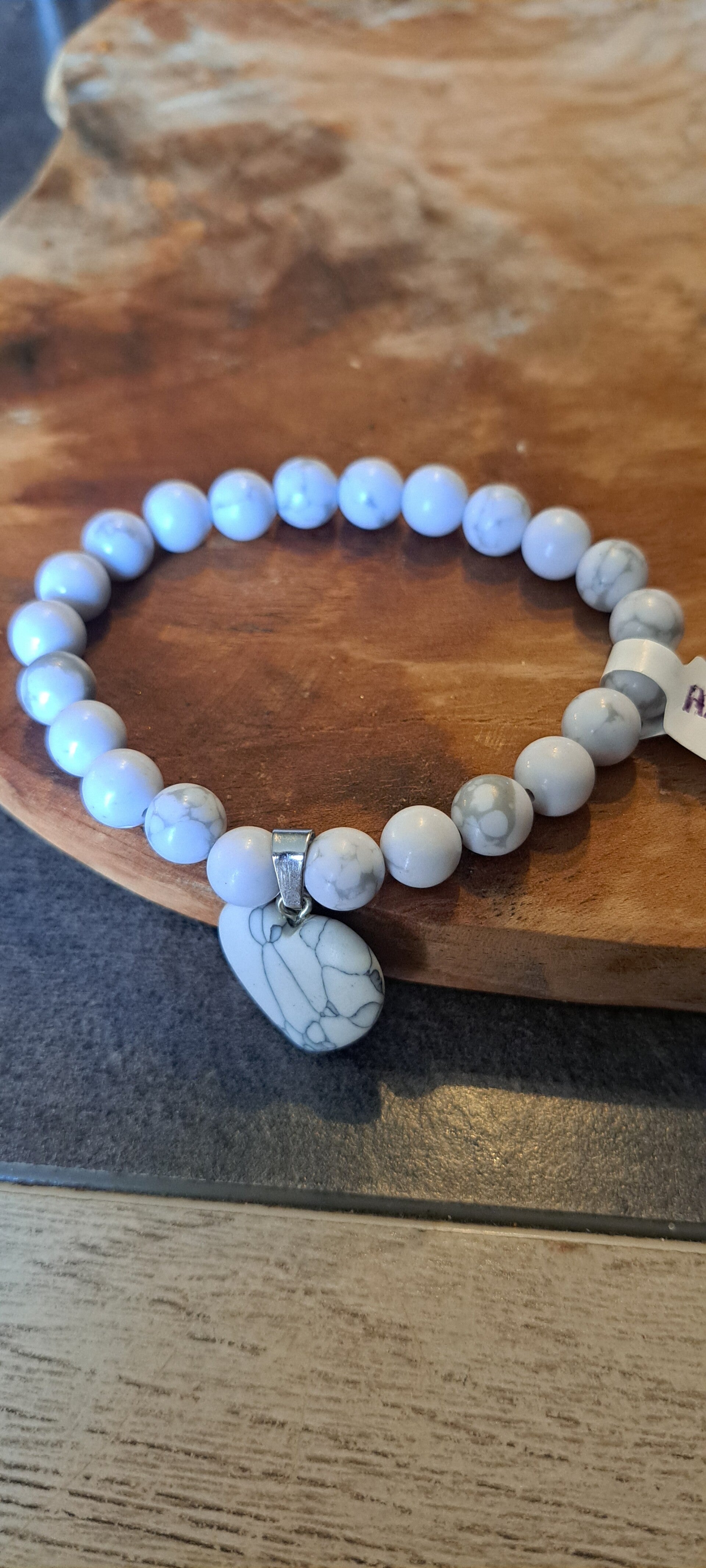 Bracelet en pierres naturelles d'HOWLITE avec pendentif coeur ou étoile en verre.