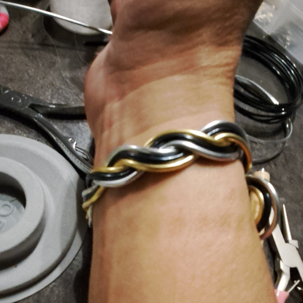 Bracelet réglable en Fil D'aluminium avec un mélange entre le oré, l'argenté et le noir.
